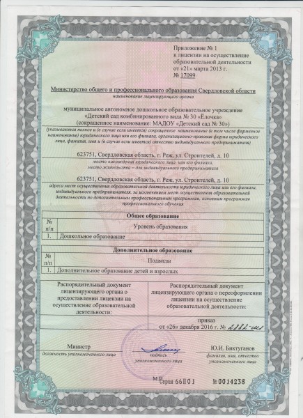 - Места осуществления образовательной деятельности по дополнительным образовательным программам: 623751, Свердловская область, г. Реж, ул. Строителей, 10
